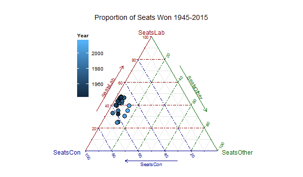 A useful application of this package in social science research is creating a visual display of parliamentary election outcomes. Specifically we can use a ternary graph to examine the distribution of seats in the British House of Commons over a period of time. Since the UK uses a proportional system to allocate seats in the House of Commons there can be a variety of outcomes in any given national election.